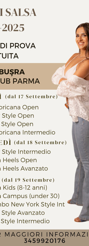 Questo è l'elenco delle Presentazioni e delle Lezioni dei nuovi Corsi di ballo per la stagione 2024-2025 che si svolgeranno presso la nostra sede in via Primo Carnera, 15 a Parma.